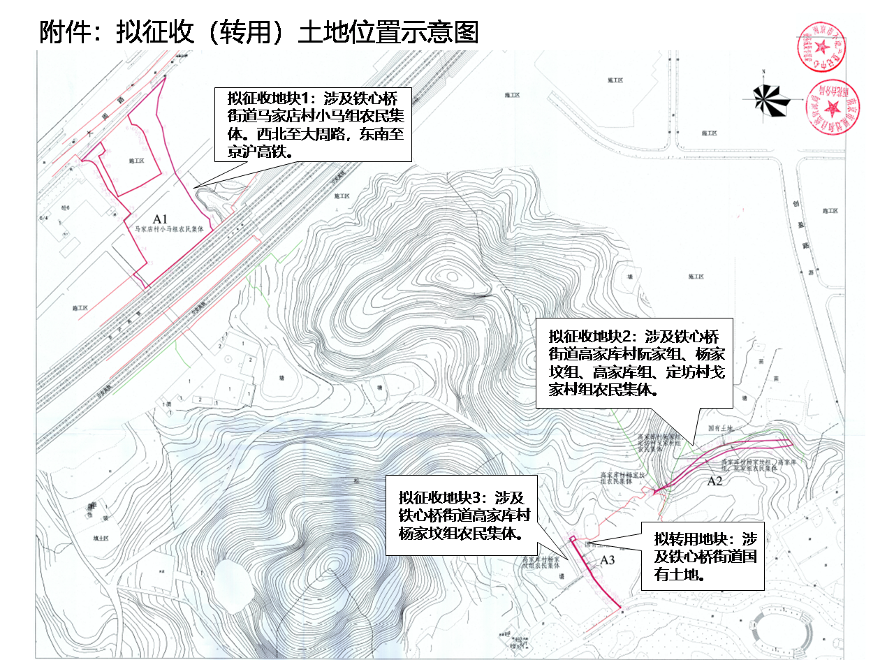 本次拟征收土地位于雨花台区铁心桥街道马家店村小马组、高家库村阮家组、杨家坟组、高家库组、定坊村戈家村组农民集体范围内。拟征收土地位置详见附图。