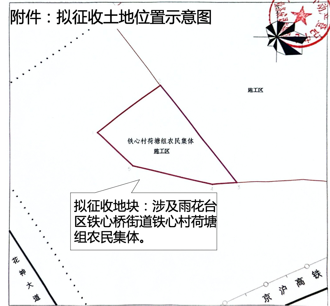 本次拟征收土地位于雨花台区铁心桥街道铁心村荷塘组农民集体范围内。拟征收土地位置详见附图。