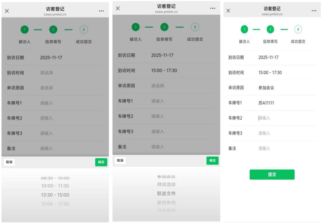 填写“到访日期”“到访时间”“来访原因”“车牌号”“备注”等相关信息。