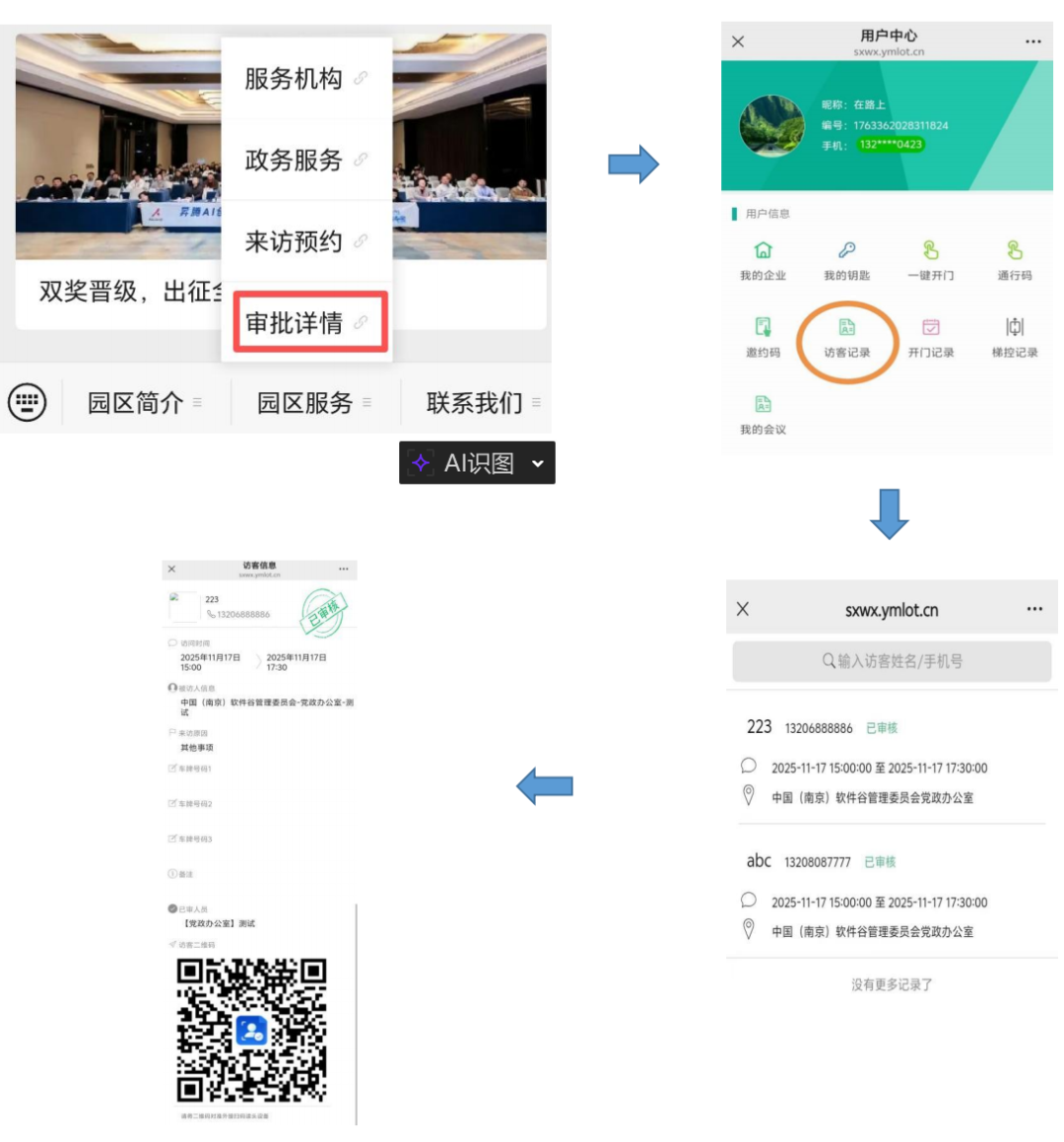 信息填写提交后,被访人会收到短信提示审批。访客可以在微信公众号“中国南京软件谷”中(园区服务→审批详情→访客记录)查收审批结果。审核通过后,访客凭审批通知在规定时间内可进入园区。