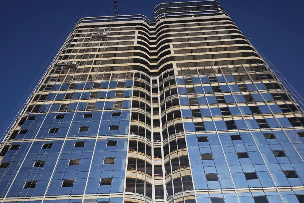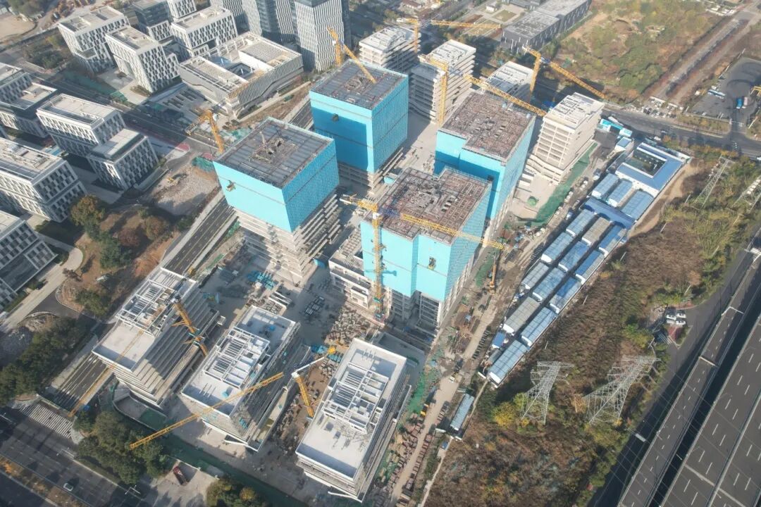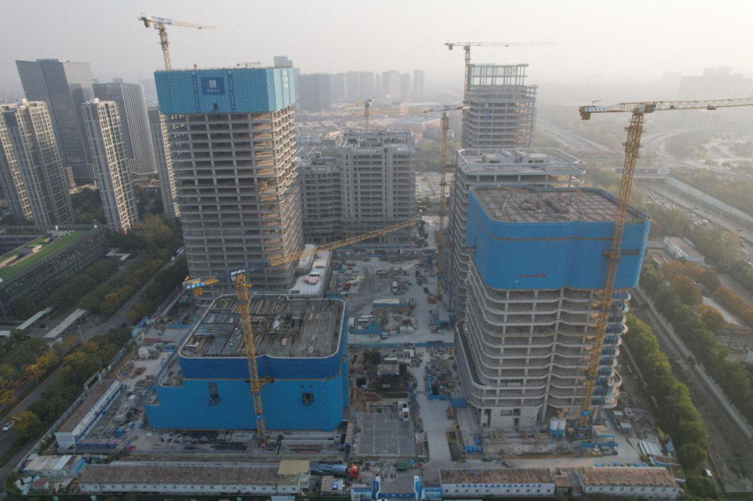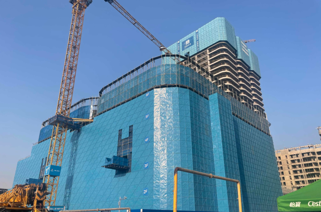 目前,项目主体全部封顶,二次结构及幕墙施工。