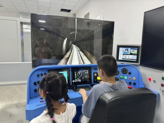 最后,也是最令人兴奋的环节,大家来到基地的模拟驾驶室,这里几乎与真实的地铁驾驶室一比一还原。高精度的模拟设备、逼真的操作界面,让孩子们仿佛置身于真实的驾驶环境中。驾驶舱内配备有先进的视景系统,能够模拟各种天气和路况条件,让孩子们完全置身于一个高度逼真的虚拟驾驶环境中,借助先进的虚拟现实技术,真实地感受到列车的加速、减速、转弯等动作,仿佛真实地在驾驶一列地铁。