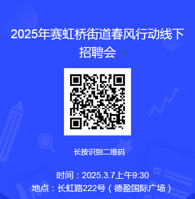 活动预告:赛虹桥街道计划于2025年3月7日召开春风行动线下专场招聘会,请有意向参与的企业扫码报名,谢谢!