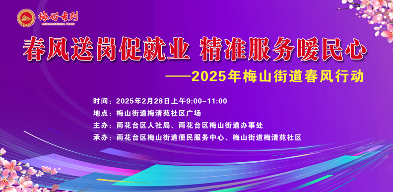 2025年2月28日(本周五)上午, 梅山街道将在梅清苑社区广场开展“春风送岗促就业 精准服务暖民心”春风行动专场招聘会。