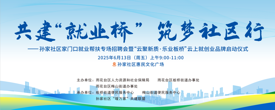 为深入贯彻落实国家就业优先政策,有效解决企业“招工难”与居民“就业难”的双重挑战,孙家社区联合区人社局、板桥街道及梅山街道,将于6月13日(周五)上午在孙家社区惠民文化广场举办“共建‘就业桥’ 筑梦社区行”家门口就业帮扶专场招聘会,并同步启动“云聚新质·乐业板桥”云上就创业品牌项目。现诚邀广大企业报名参与,共筑就业桥梁,助力社区发展!