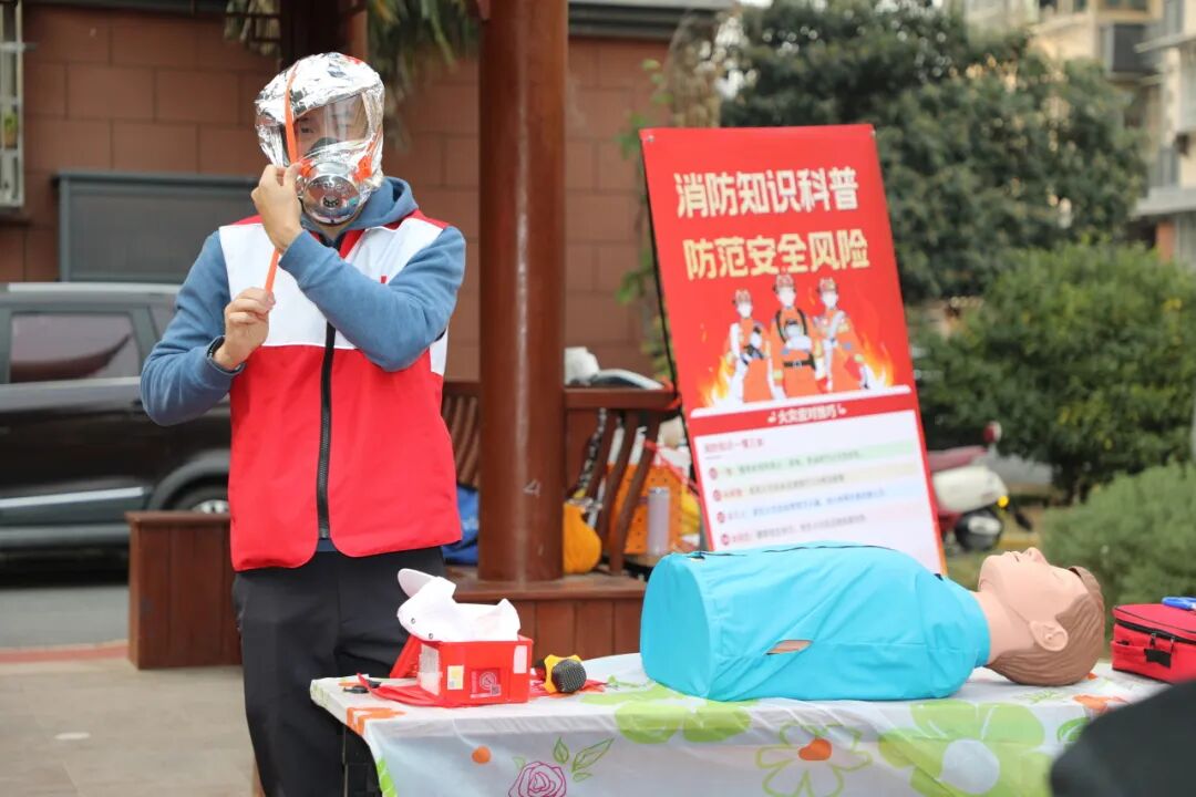 安全是社区幸福生活的基石,本次活动将应急消防培训及演练作为重点环节。雨花台区红十字会师资周旺老师首先系统讲解了消防应急知识,灭火器、灭火毯、消防面罩等常见消防器材的使用方法。操作灭火器扑灭油盆火,练习快速佩戴消防面罩,铺开灭火毯进行覆盖灭火等。并重点介绍了AED(自动体外除颤器)和CPR(心肺复苏)等急救技能的关键操作步骤。
