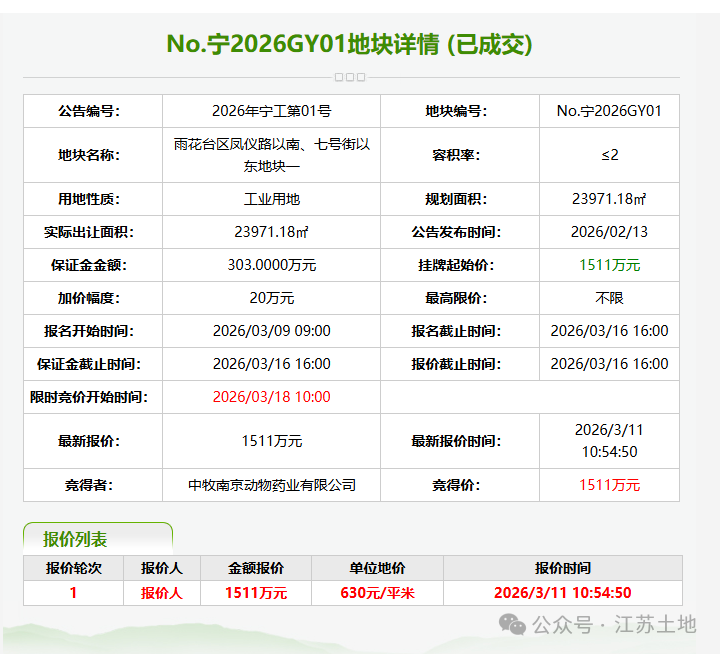 两幅地块分别由中牧南京动物药业有限公司、睿龙材料科技无锡股份有限公司以1511万元、1517万元竞得,其中:GY01地块出让面积23971.18㎡,将用于建设高端制剂及宠物食药产品加工出口基地、兽药新制剂科创中心;GY02地块出让面积24065.35㎡,将用于建设半导体基材与电子材料相关配套产业;两幅地块的亩均投资强度均达550万元。