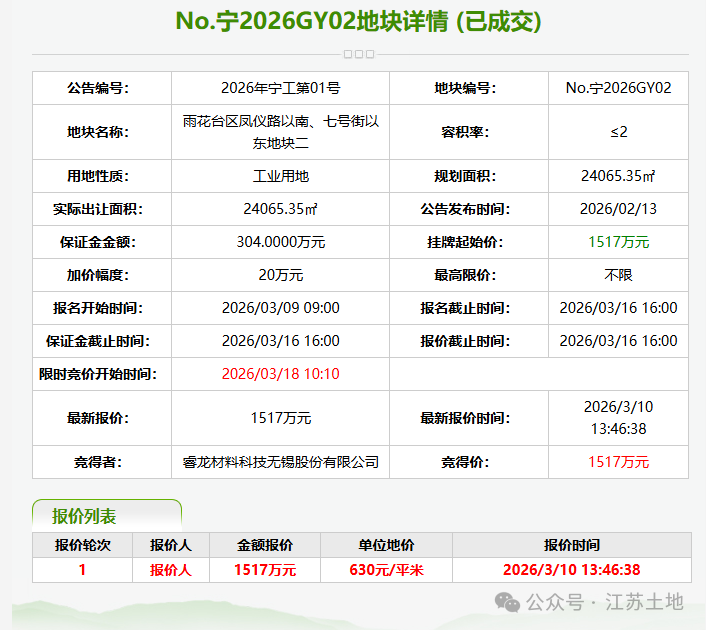 雨花经济开发区成交的NO.宁2026GY01地块、NO.宁2026GY02地块均为工业用地,位于园区核心产业片区,凤仪路以南、七号街以东,两幅地块左右相邻,GY02地块东侧为普天鸿雁电器科技有限公司。