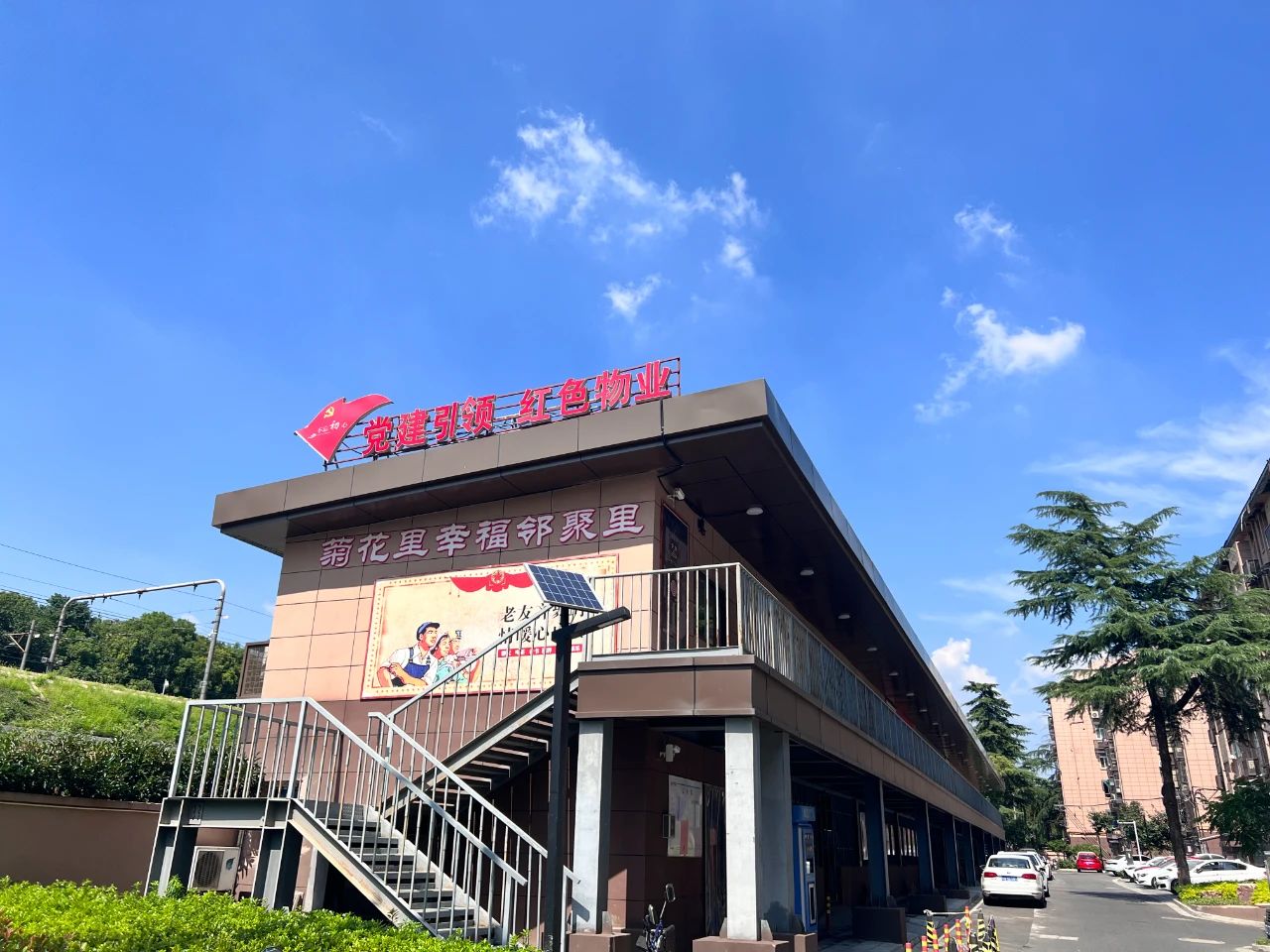 菊花里社区幸福邻聚里红色阵地。菊花小区建于上世纪八十年代,是一处有着32栋楼的老小区,2022年完成了出新改造工程,获评“省级宜居示范居住区”,在出新改造过程中,为消除“飞线”充电等不安全不稳定因素,菊花里社区建设了5个充电桩车棚。同时社区立足群众精神文化需求,将最大的一处车棚二楼400平空间,打造成“幸福邻聚里”阵地,阵地设计成贴近居民喜好的80年代的风格,打造邻里治、邻里医、邻里乐、邻里助、邻里学、邻里睦、邻里聚“七大板块”。红色物业、家庭医生工作室、便民服务室、共享阅读空间、老支书工作室、红色茶馆等场所的打造,不仅在老龄化老小区打造“足不出户”的便民服务站点,更将接地气的红色茶馆、红色放映厅等搬进小区,实现“就地、就近、就亲、就熟、就便”的最佳平台。