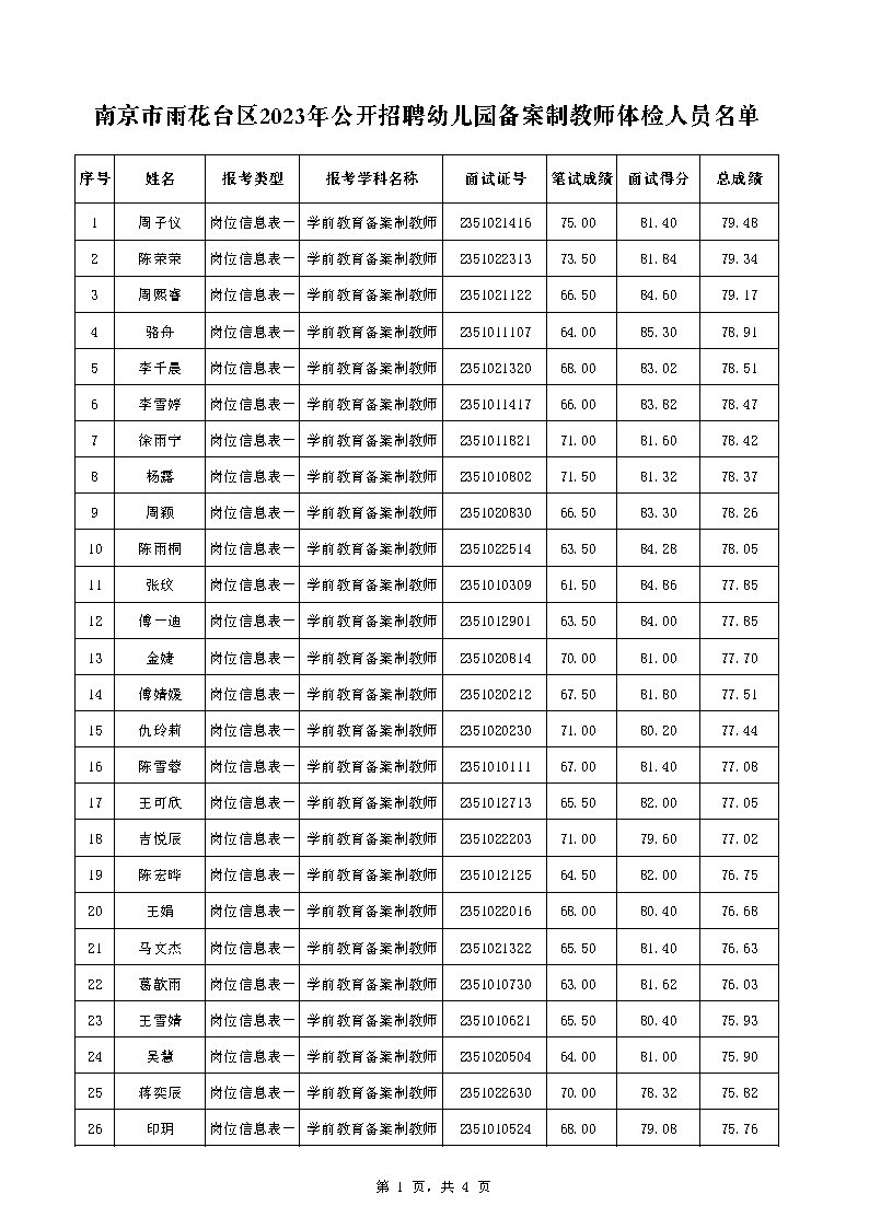 南京市雨花台区2023年公开招聘幼儿园备案制教师体检人员名单公告
