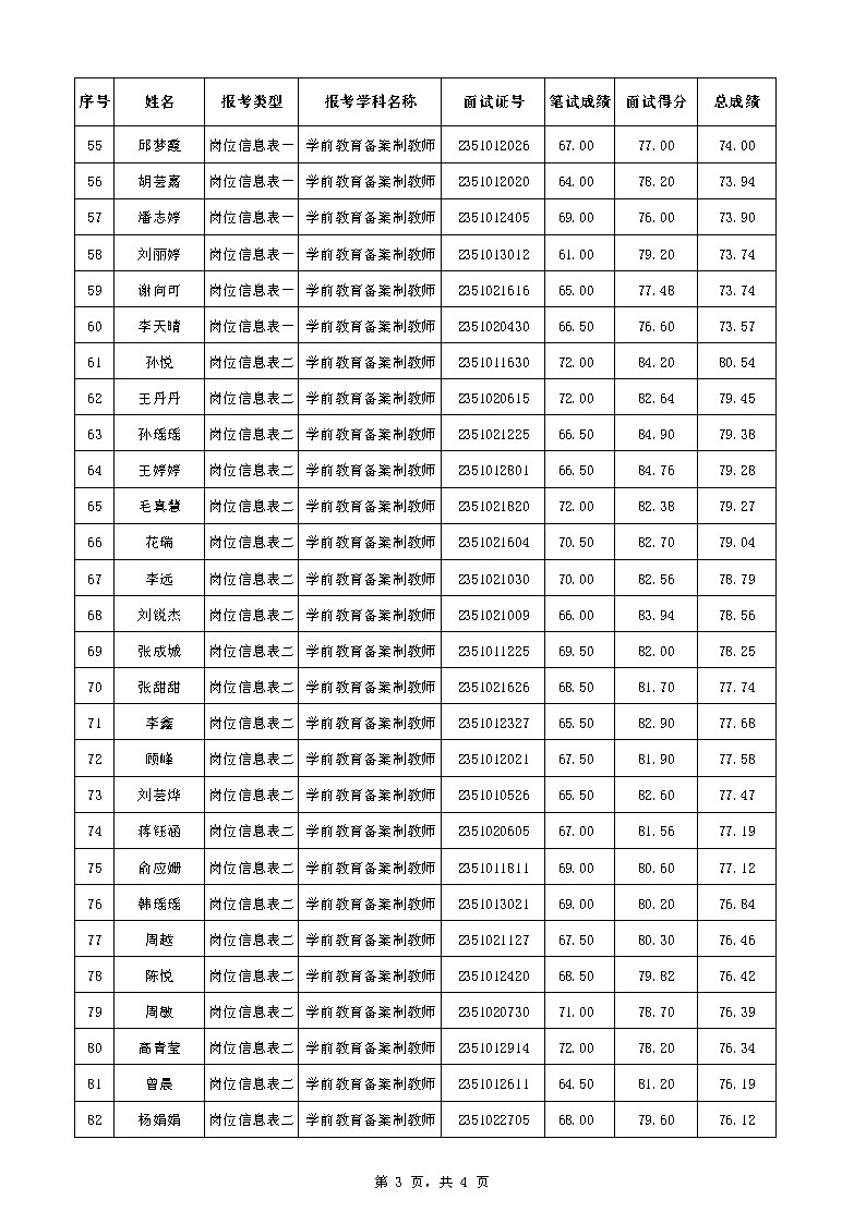 南京市雨花台区2023年公开招聘幼儿园备案制教师面试工作已经结束,根据《南京市雨花台区2023年公开招聘幼儿园备案制教师公告》(宁雨人招公告﹝2023﹞2号)规定,以考试总成绩的顺序按岗位招聘数1:1的比例确定了体检人选名单(见附件:南京市雨花台区2023年公开招聘幼儿园备案制教师体检人员名单)。