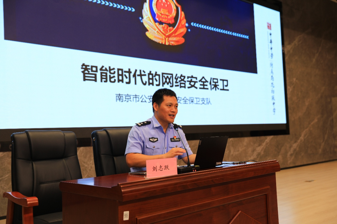 第一天,南京市公安局网安支队副大队长刘志跃以《智能时代的网络安全保卫》为题,围绕当前国内外网络安全形势,剖析常见网络安全事件,并就提升单位与个人网络安全防范意识提出对策,他不仅解读了有关网络安全法律法规,更给出可落地的“防护攻略”——从定期更换复杂密码、使用加密存储工具、关闭不必要的APP授权等个人防护细节入手,强化网络安全意识。