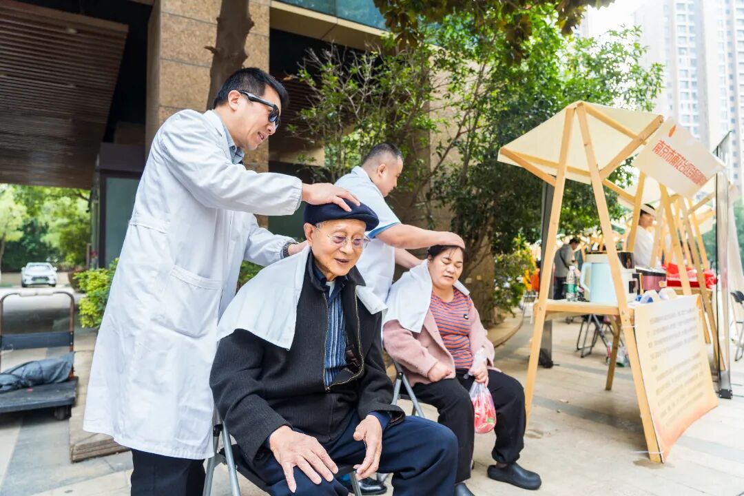 赛虹桥街道养老综合服务中心的中医推拿和中药茶饮摊位前排起了小队,南京嘉年乐的健康产品体验,让老人们亲身感受科技为生活带来的便利。