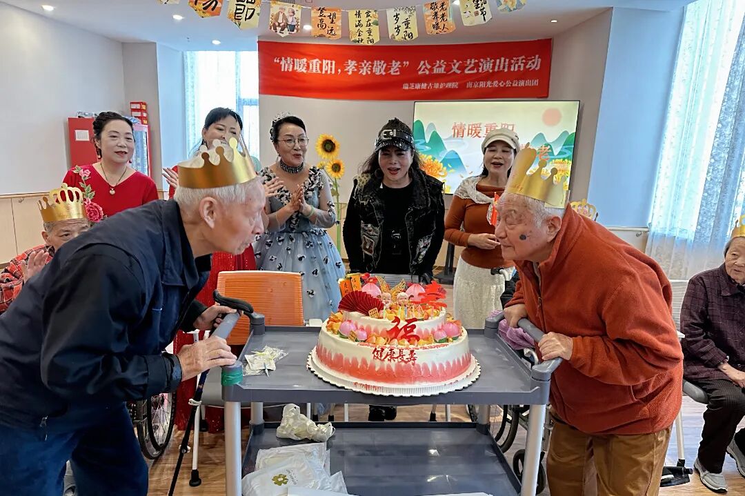 古雄街道养老综合服务中心联合瑞芝康健古雄护理举办了“重阳节暨十月长者生日会”双庆活动,以爱为媒,为护理院内长者们送上一份专属的温暖与敬意。活动特别邀请南京阳光爱心公益演出团带来精彩义演,还为十月生日的寿星们精心筹备了集体生日会,大家齐唱生日歌、共切甜蜜蛋糕,在温馨互动中分享喜悦、定格幸福。