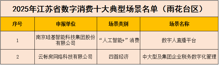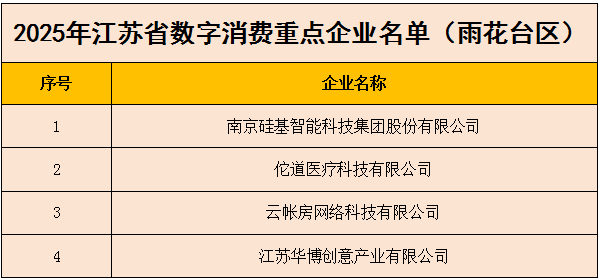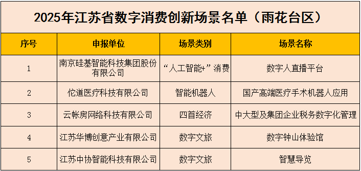 近日,2025年江苏省数字消费创新场景和重点企业培育名单公示,雨花台区数据局统筹组织、积极推荐辖区重点企业申报,斩获多项荣誉,企业入选数量全市第一。其中,4家企业当选2025年江苏省数字消费重点企业、5个场景入选2025年江苏省数字消费创新场景、2个场景入选2025年江苏省数字消费十大典型场景,覆盖人工智能+消费、智能机器人、数字文旅等多个类别。