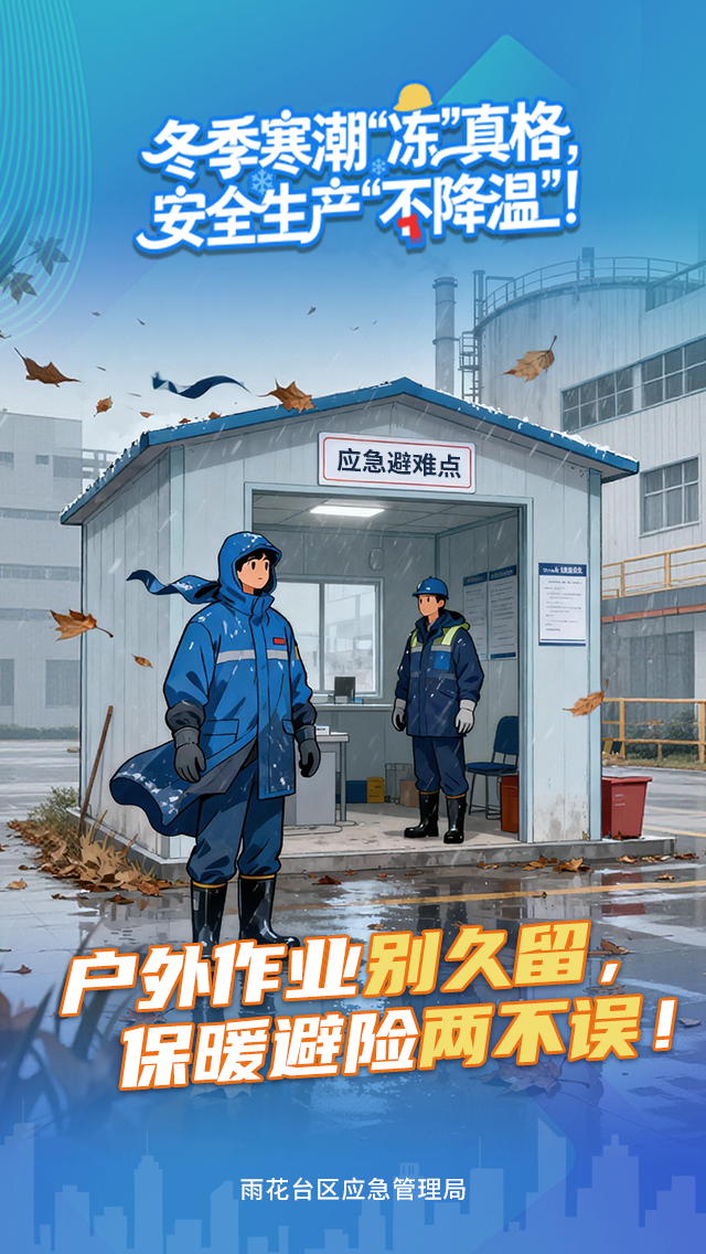 寒潮来临气温“断崖式”骤降,体感湿冷,减少非必要户外逗留,作业人员需穿戴防风防水防寒服、防滑靴及防护手套,严格控制户外作业时长,在厂区设置应急避险点,避开临时搭建物、大树等易倾倒区域。