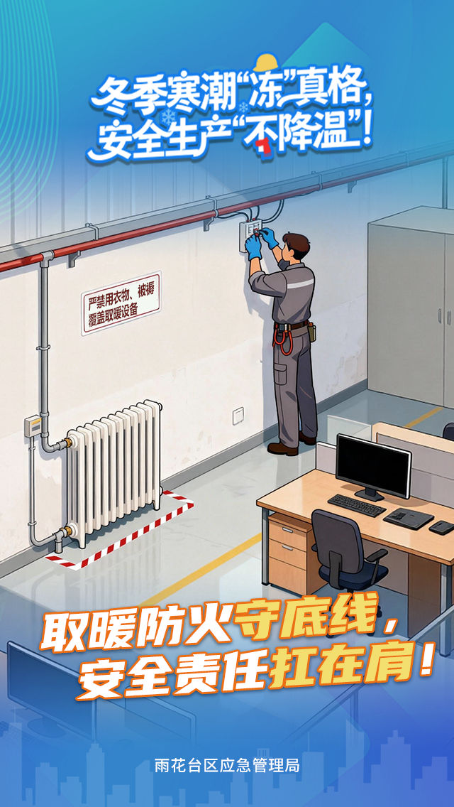 规范操作各类室内取暖设备,暖气片、电暖器、暖风机等周边1米内严禁堆放纸箱、布料、木材等易燃物品,严禁用衣物、被褥覆盖取暖设备。落实安全巡查制度,定期检查设备线路、外壳温度及运行状态,杜绝设备超负荷运行,下班或离开时务必关闭电源、火源,严防高温引燃可燃物引发火灾事故。