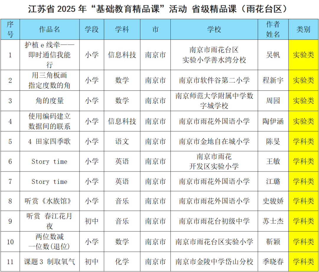 雨花台区教师在“基础教育精品课遴选”活动中全区11位教师获评为“省级精品课”,学科类数量全市第一!