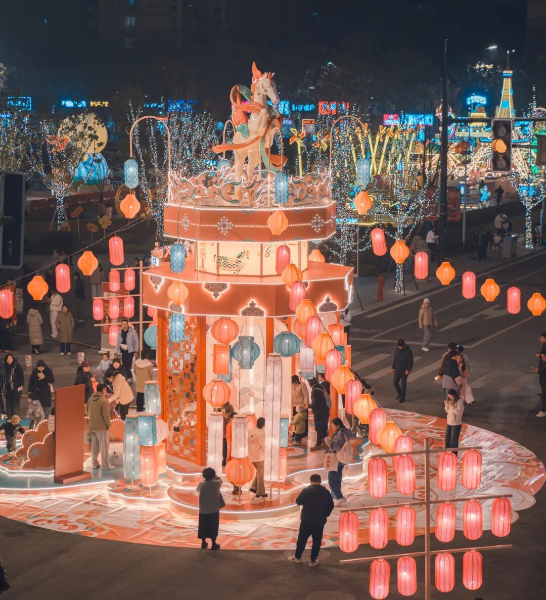步入灯会现场,最引人注目的莫过于以敦煌壁画为灵感设计的系列灯组。飘逸的“天马”自画卷中跃出,踏着云纹灯影,与江南园林式的布景相映成趣;“鱼灯巡游”队伍穿梭其间,光影流动,仿佛古老传说在街头复苏。游客不仅能拍照留念,更可亲身参与“拓印迎春”“非遗手作”等互动体验,在动手之间感受传统文化与现代创意的巧妙结合。