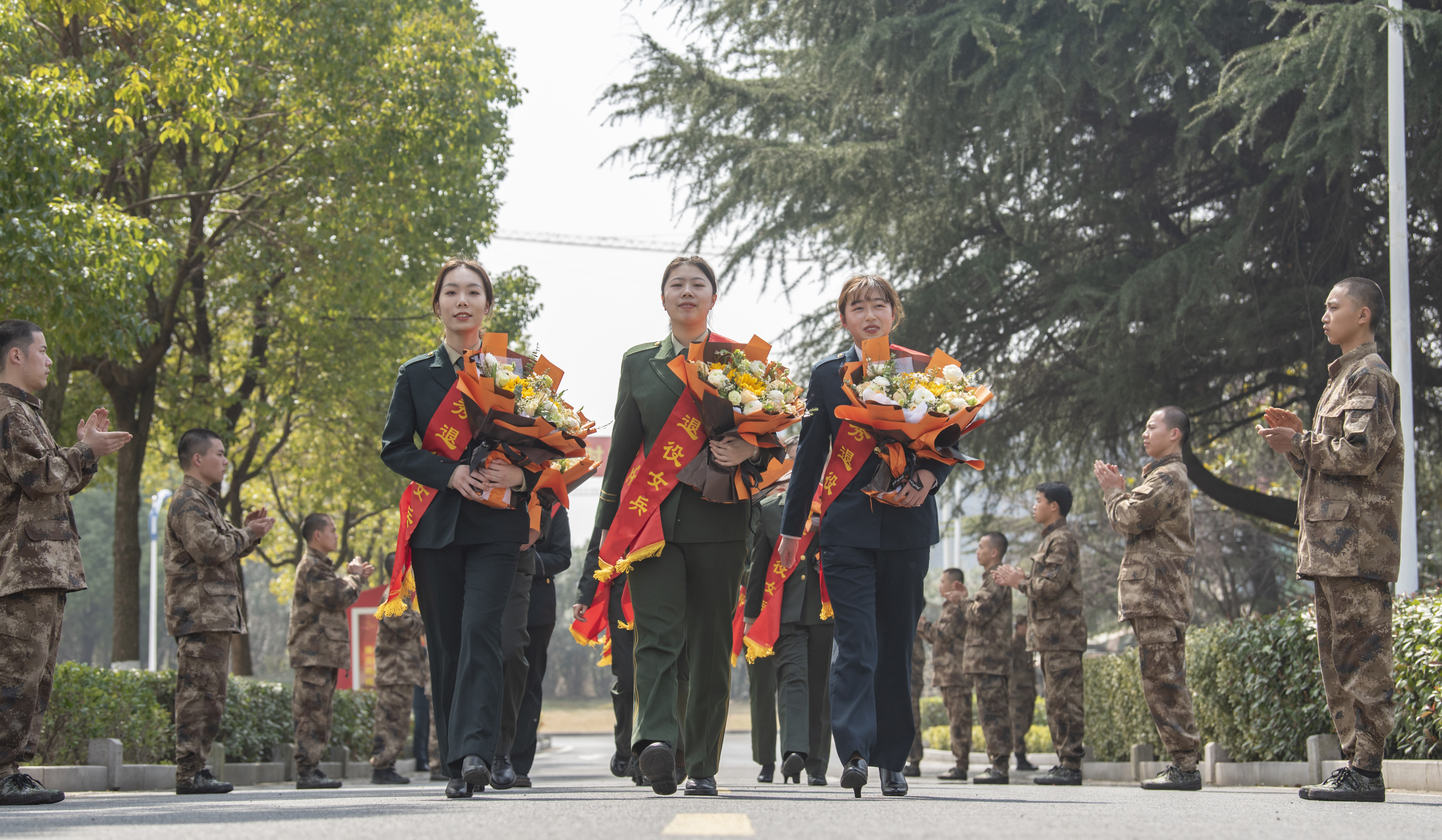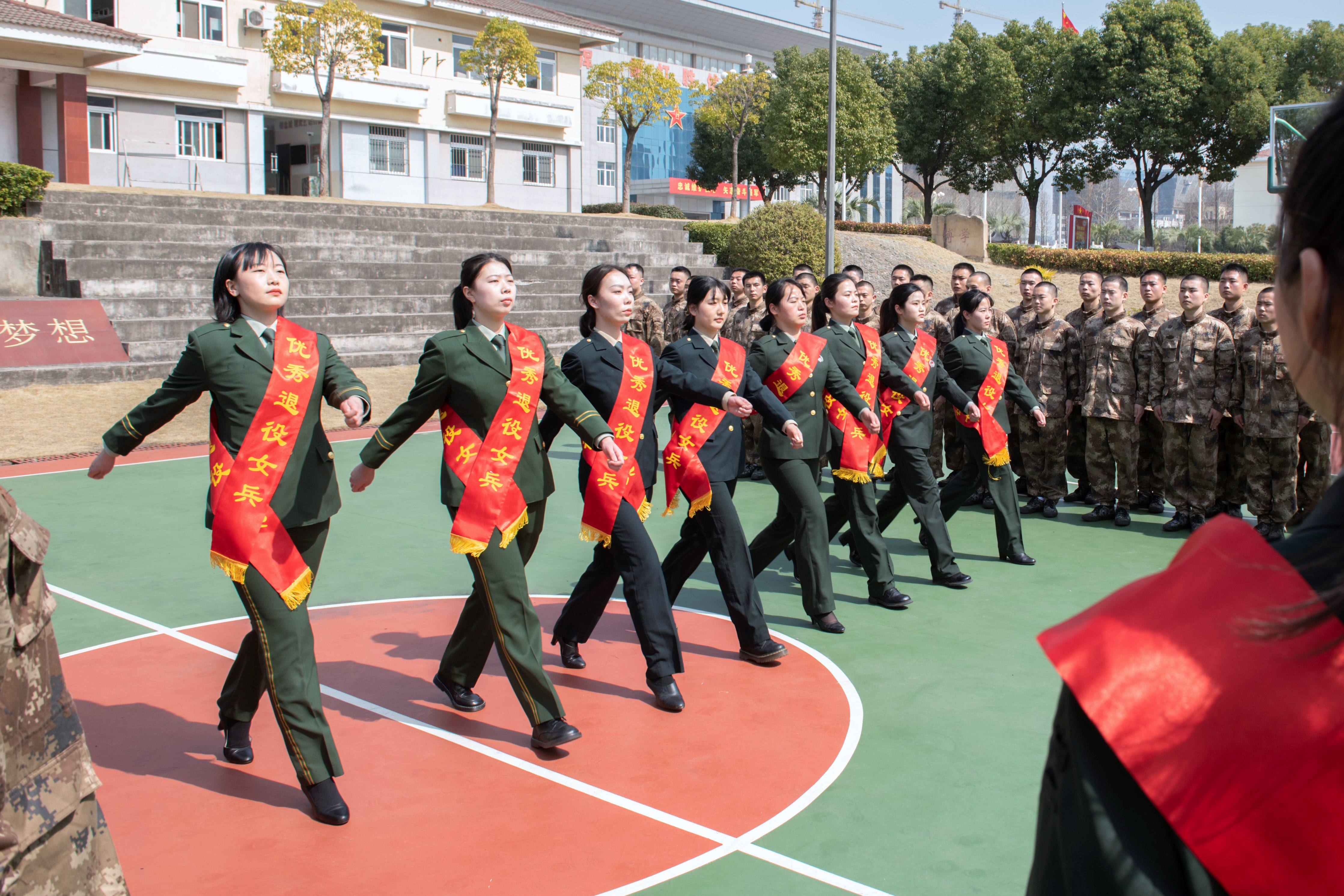 十名退役女兵曾服役于解放军仪仗队、武警部队、火箭军、海军等军兵种。再次回到军营的她们,回归军人本色,向即将入伍的应征青年们传授规范的队列动作,解放军仪仗队退役女兵陈雯雯用标准清脆的口令带领退役女兵代表们进行队列会操表演,引发现场阵阵掌声。之后,应征青年们在操场围坐,聆听退役女兵们为他们讲解军营生活,帮助他们解决入伍前的各种困惑。最后,大家以一曲“团结就是力量”结束了今日的分享,在高昂激荡的歌声中挥手告别。
