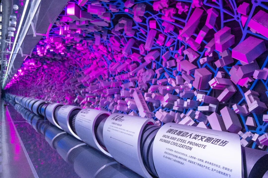 钢铁体验馆·钢铁是怎样炼成的:带领大家走进钢铁体验馆,以“钢铁是怎样炼成的”和“钢铁推动人类文明进步”为展陈思路,分为“钢之源”“钢之炼”“钢之城”三个部分,通过新媒体互动技术打造集体验、科普、教研、打卡、娱乐于一体的全场景沉浸式体验展馆,全方位展示钢铁冶炼和轧制过程。