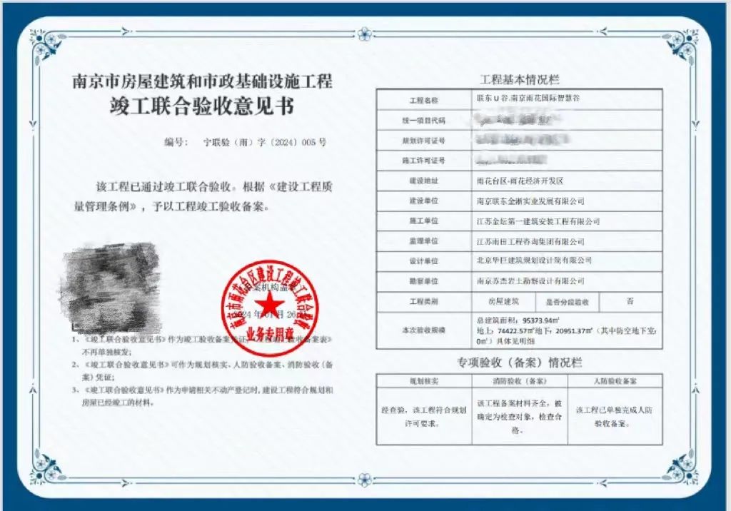 2024年1月26日,雨花台区行政审批局向联东U谷·雨花国际智慧谷产业园项目核发《竣工联合验收意见书》。当天,产业园区便为部分业主办理了入驻手续,成为雨花台区首个实现“竣工即投用”的项目。